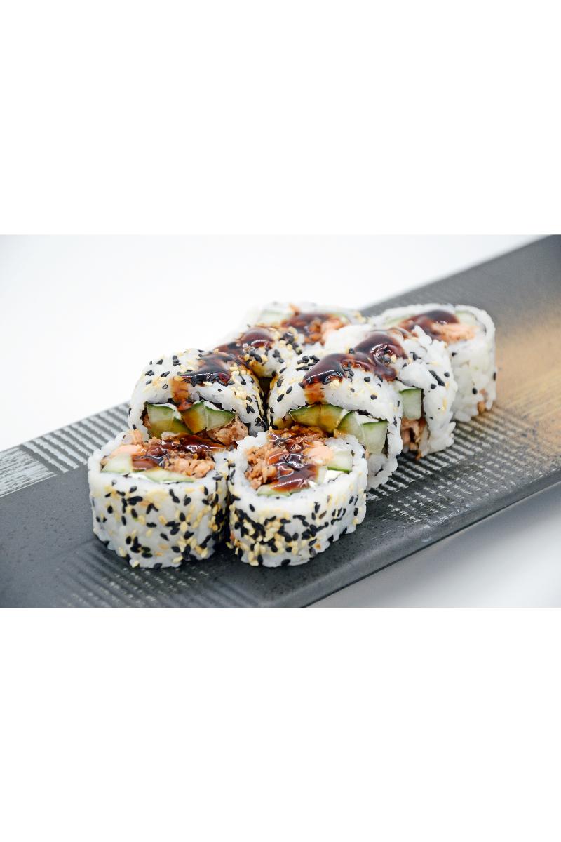 Stekt laks, agurk, Philadelphia, sesam, teriyaki på toppen