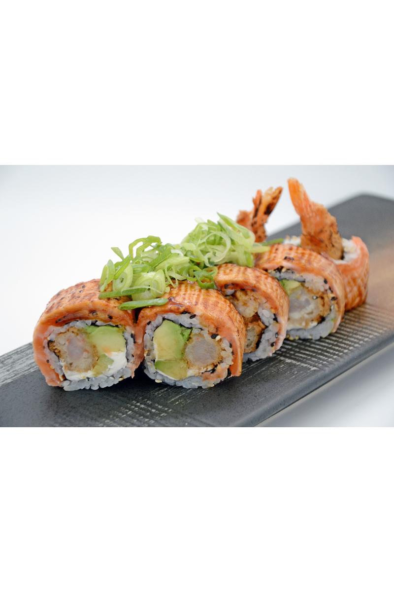 Tempura reker, avokado, Philadelphia, sesam, laks aburi og gressløk på toppen