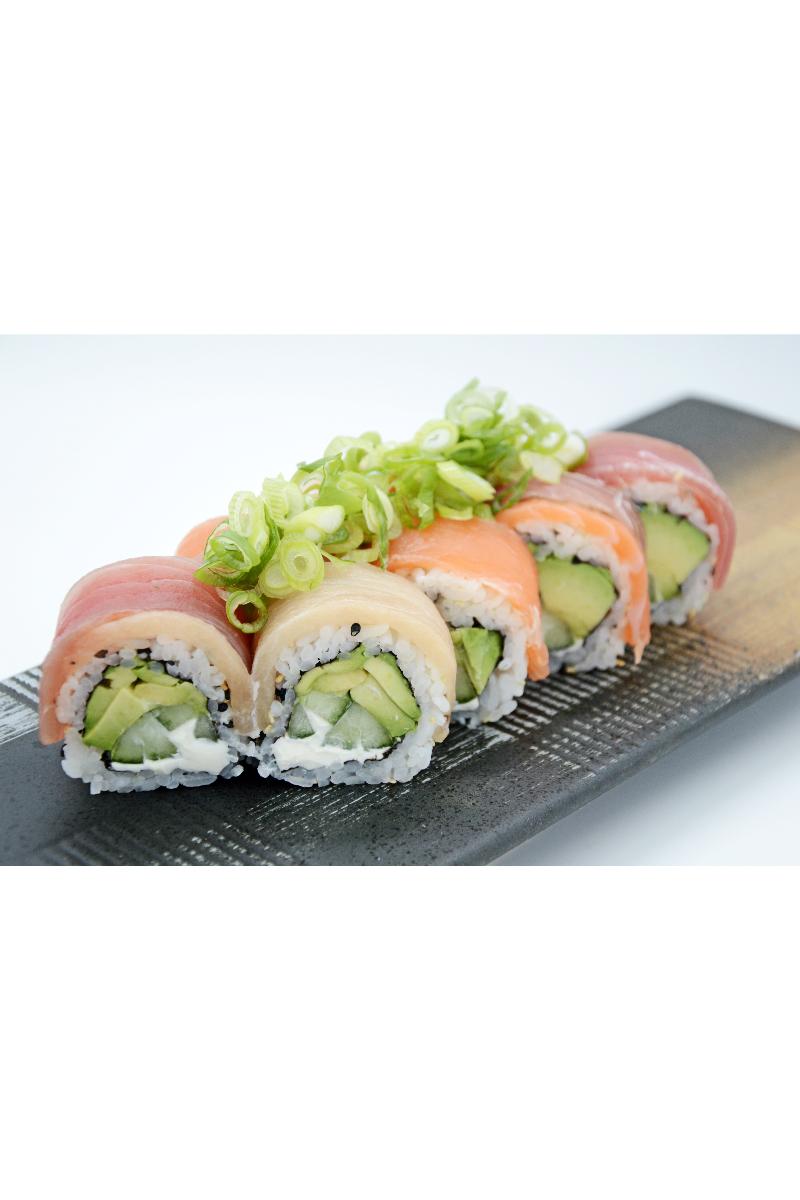 Agurk, avokado, Philadelphia, sesam, laks, hamachi, tunfisk og gressløk på toppen